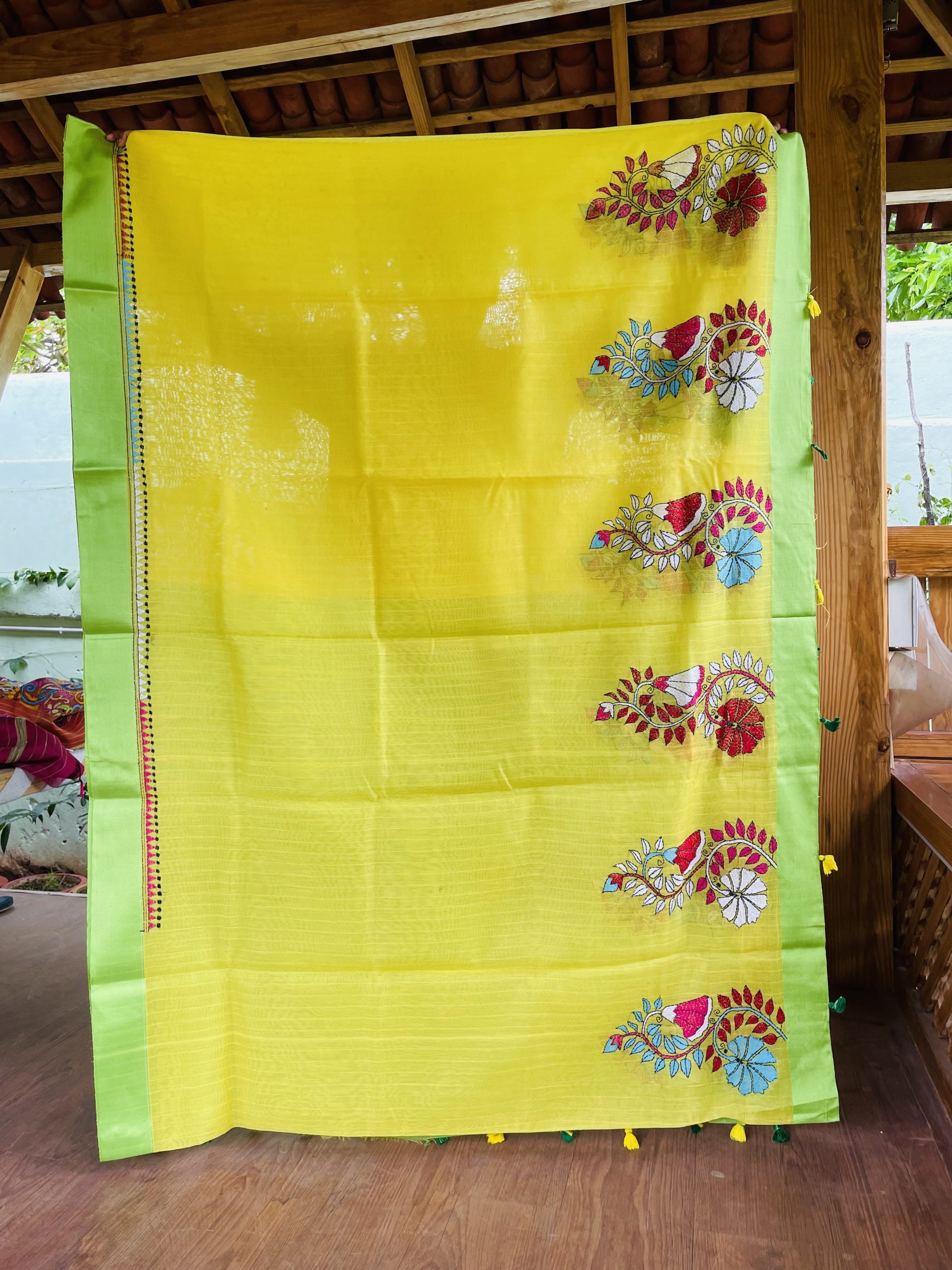 Kaantha, also spelled Kantha is a type of embroidery craft mainly practiced in the states of West Bengal, Tripura and Odisha.In these sarees the embroidery is stitched on saris which is practiced mainly in the Rural Reigon but now this art form has gained a lot of recognition in the last decade.