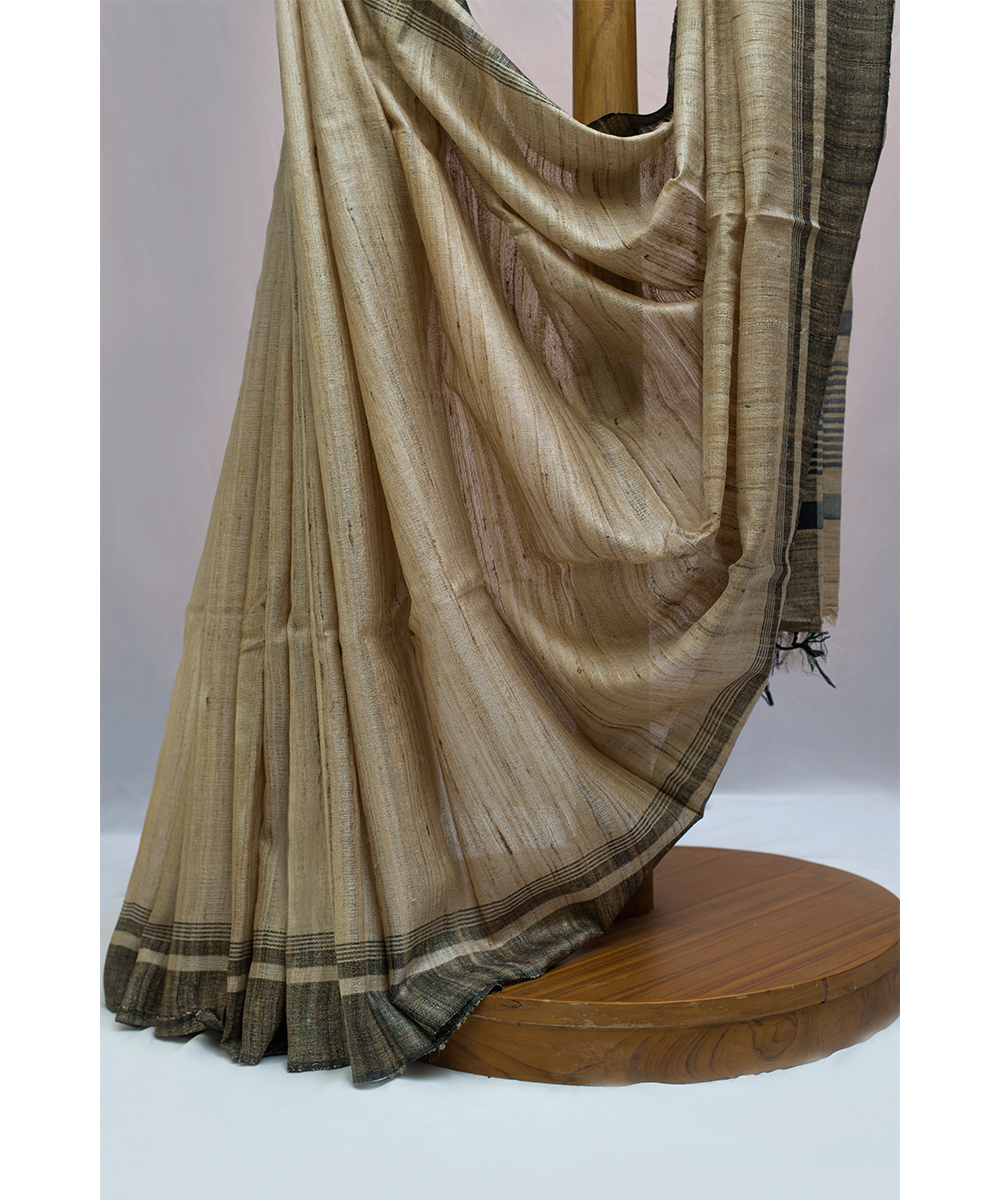 This Beige coloured saree comes with a running blouse piece.The material of the saree is a mixture of Gicha silk and tusaar silk.Gicha silk is mainly produced in Bhagalpur district of Bihar. these silks are more durable and can be worn throughout the year. The material is soft but it also has a dense texture.Golden zari work can be seen on the border.There are golden stripes in the pallu.